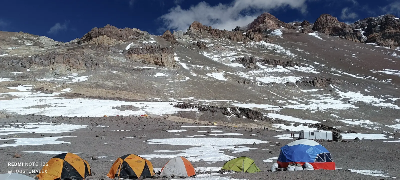 Beginning of the high-altitude phase. Steady ascent to Camp Canadá, the first high camp. Tent setup and rest.