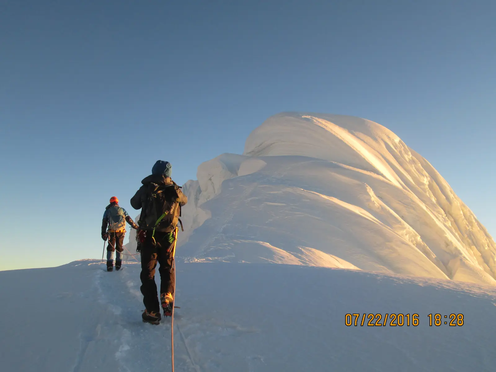 We will depart from high camp at around 1 am, during the ascent we will find slopes of 50-60° until we reach Chopicalqui summit. From the summit we will enjoy spectacular views of the surrounding snow-capped mountains such as the Huascaran, Chacraraju, Pisco, Huandoys, and others. Soon we will begin to descend by the same route of ascent until we reach high camp or the moraine camp (optional depending on the physical condition). Approximate duration of climbing 9 to 12 hours