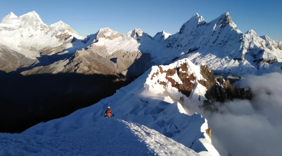 Nevado Yanapaccha (5,460 m / 17,913 ft) offers a more technical experience, perfect for climbers ready to progress to steeper terrain. The route involves glacier travel, crevasse navigation, and exposed snow and ice sections, culminating in a beautiful and narrow summit ridge. From the top, climbers are rewarded with impressive views of Huascarán, the highest mountain in Peru, and the surrounding glaciers of the Cordillera Blanca.