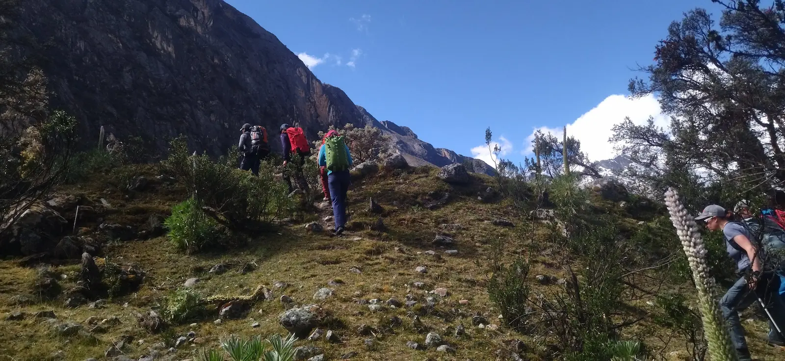 This day we leave in direction of the valley uphill, towards the most popular pass of the trek, managing to overcome zigzag paths. Arriving at Punta Union pass at 4750 m.a.s.l., you will be able to observe a charming view around the pass of the majestic mountains of Santa Cruz, Quitaraju, Alpamayo, Pukajirca, Taulliraju, and the Taullicocha lake. Then we will descend through the rocky path finding along the way other singular lakes. Finally, we will arrive at the camp of Paria, a place surrounded by bushes and Quenuales.