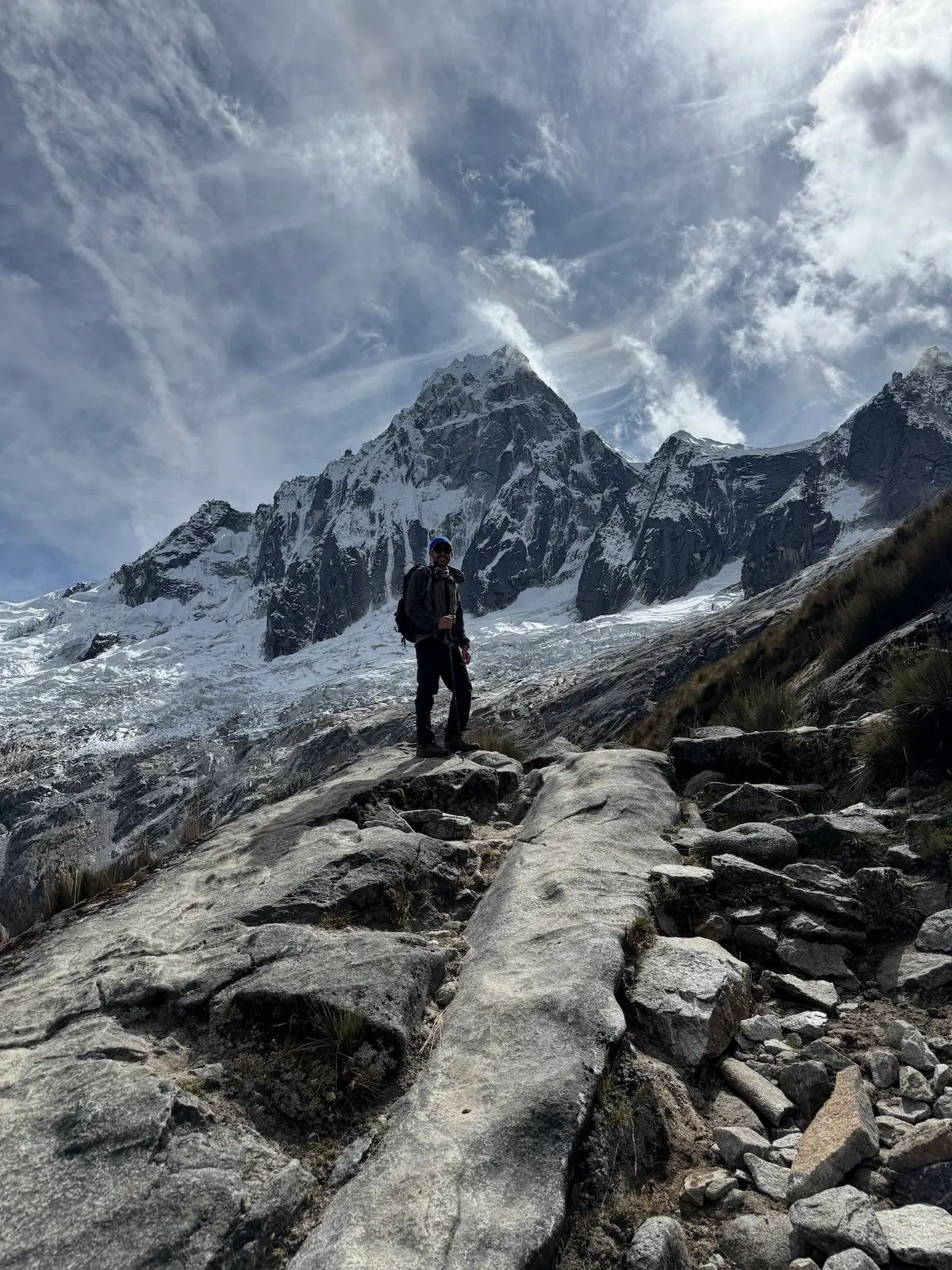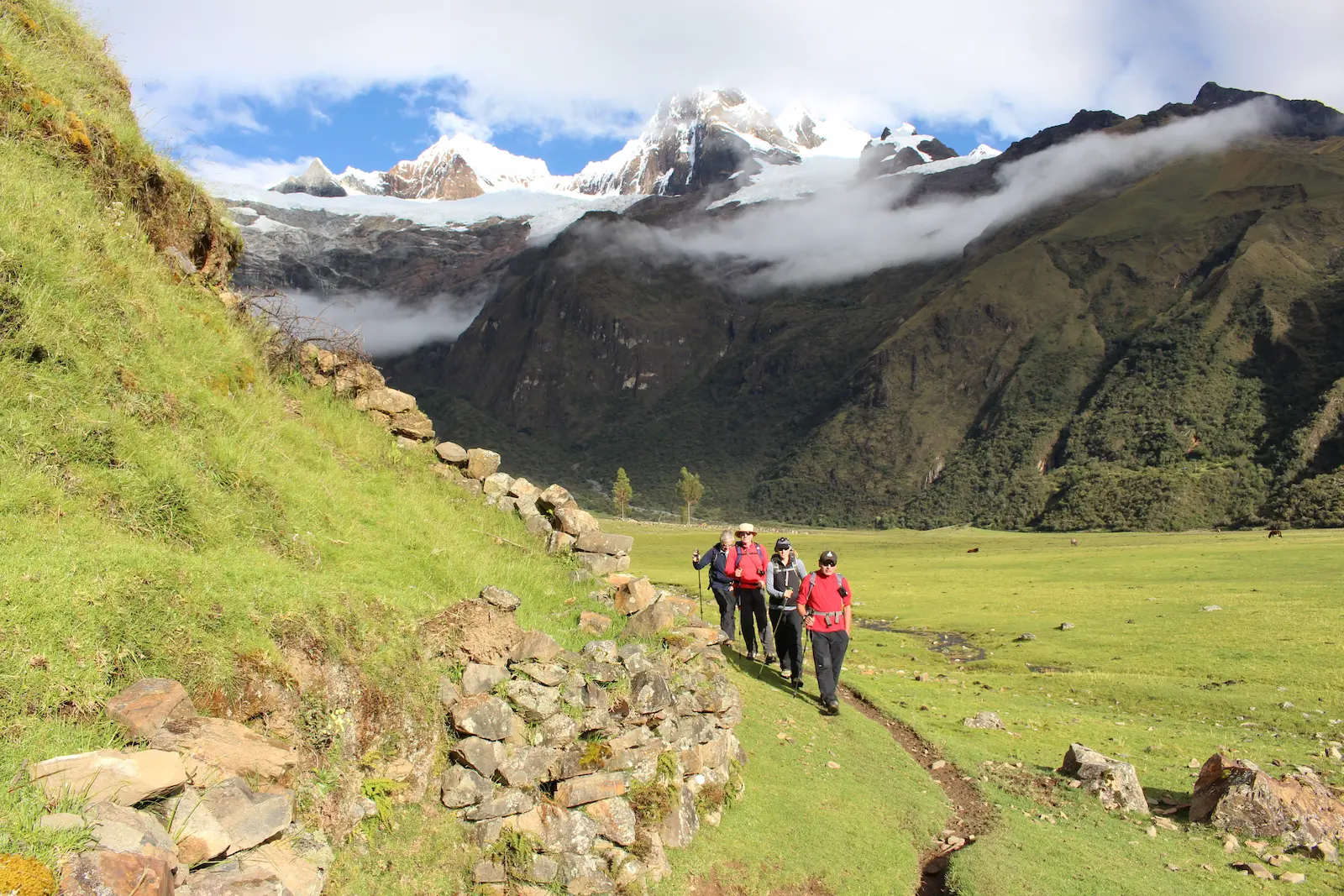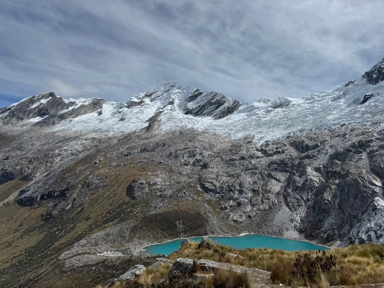 We start the hike by a marked path up the valley which will take us to two passes. The first pass, called Qara Qara at 4830 meters above sea level or also called the continental divide, usually encountering strong winds and snow fall depending on the season. Here you have front seat views of the imposing snowy Quitaraju (6.036m), then we will descend down to the valley of Mesapampa, thus arriving at the second pass of Mesapata at an altitude of 4350masl. Here you can see the Sajuna lake and as we continue down the valley of Tayapampa we will finally arrive at the Huillca campsite, generally we will see llamas grazing around the camp.