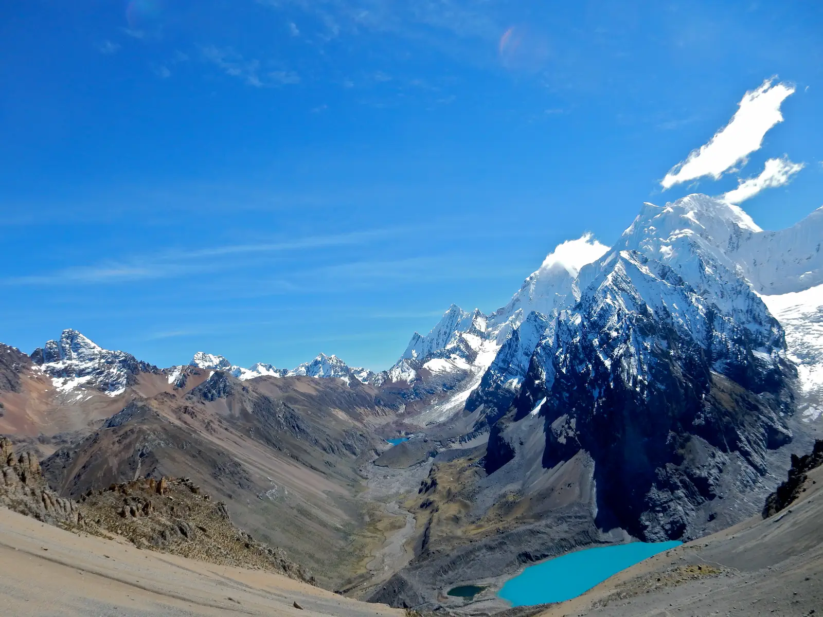 We will leave early in the morning until reaching the highest point in the trek, the Paso Santa Rosa pass (5070m). from this high point we will have spectacular and beautiful views of the highest mountains of the Huayhuash range like the Nevados Yerupaja, Sarapo, Jurao and impressive turquoise lakes, finally, we will descend towards the Cutatambo valley (5 to 6 hours approx. of trekking), until the camp of Cutatambo 4265masl.